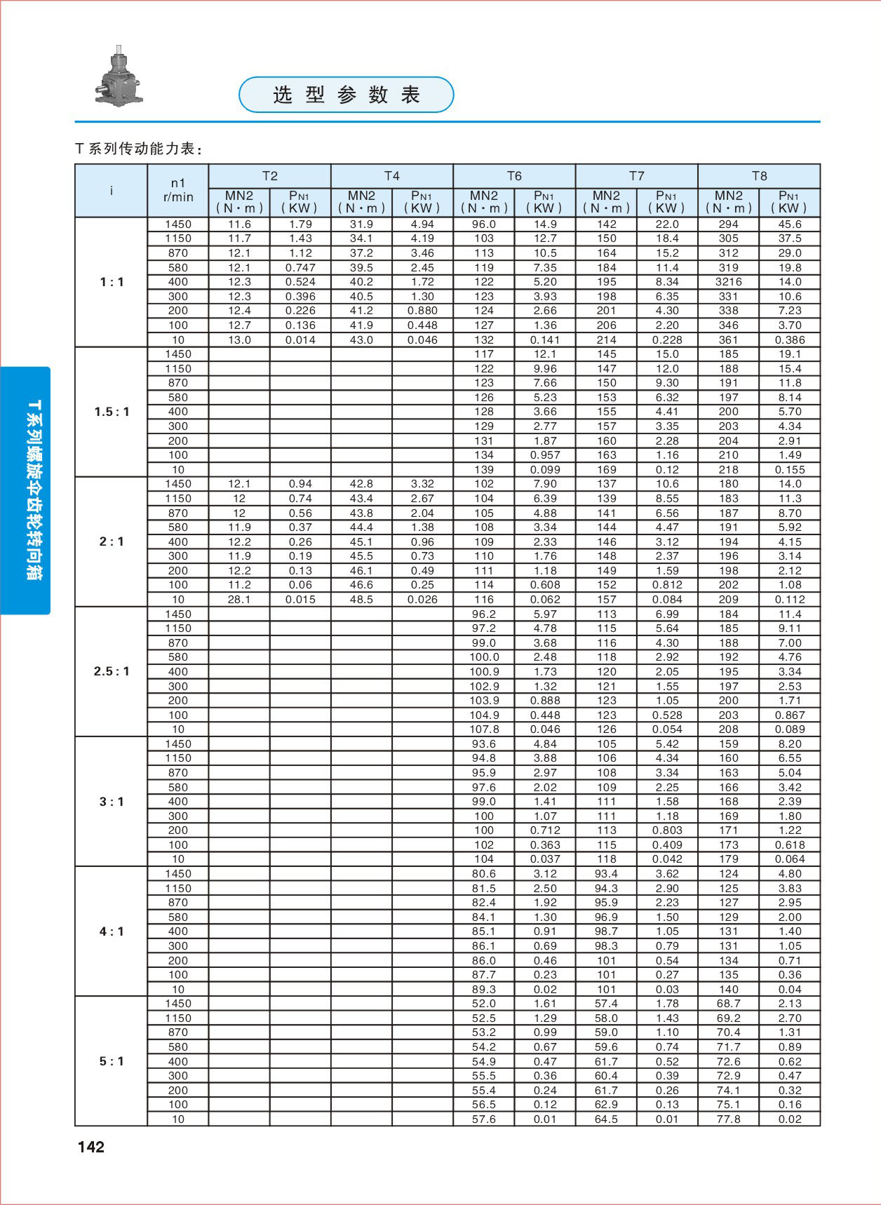 T螺旋錐齒輪換向器產(chǎn)品特點(diǎn): 1、機(jī)殼:采用高鋼性FC-25鑄鐵鑄造; 2、齒輪:采用優(yōu)質(zhì)高純凈度合金鋼50CrMnT調(diào)質(zhì)加工,經(jīng)滲碳淬火處理及研磨而成; 3、主軸:采用優(yōu)質(zhì)高純凈合金鋼40Cr調(diào)質(zhì)加工,具備高懸重負(fù)荷能力。 4、軸承:配備具重負(fù)荷能力的滾錐軸承; 5、油封:采用進(jìn)口雙唇油封,具有極高的防塵防漏油能力。 產(chǎn)品潤滑: T系列螺旋錐齒輪換向器適當(dāng)?shù)臐櫥褪褂?,可以發(fā)揮轉(zhuǎn)向機(jī)的效率,并提高其運(yùn)轉(zhuǎn)的壽命。 1、減速機(jī)初期使用二周或100-200小時,為初磨耗期,這之間可能有少許金屬磨耗粉粒,請務(wù)必清潔內(nèi)部,并換新潤滑油; 2、長期使用時,每半年-一年或1000-2000小時更換一次潤滑油。 技術(shù)參數(shù): 可配單橫軸、雙橫軸、單縱軸、雙縱軸 速 比:1:1 、1.5:1、2:1、2.5:1、3:1、4:1、5:1 產(chǎn)品型號: T2、T4、T6、T7、T8、T10、T12、T16、T20、T25